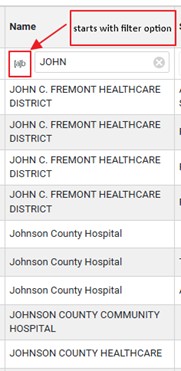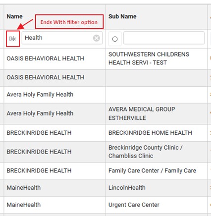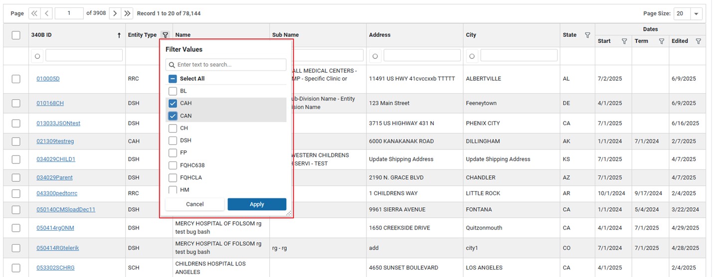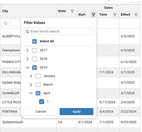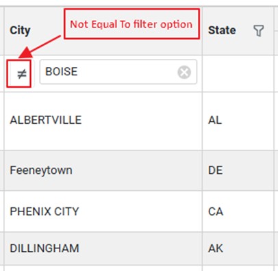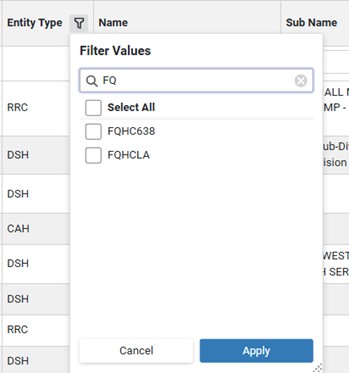 There are columns that have fields which can take any one of specific set of values such as Entity Type, State, Zip, and Status. For such fields, when you select to filter on the column, the drop-down list will display the list of values that are available in the Result set.