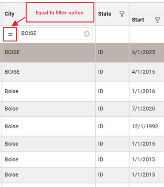 The filter options are: Contains, Starts With, Ends With, Equal To, Not Equal To, Empty, NotEmpty |
