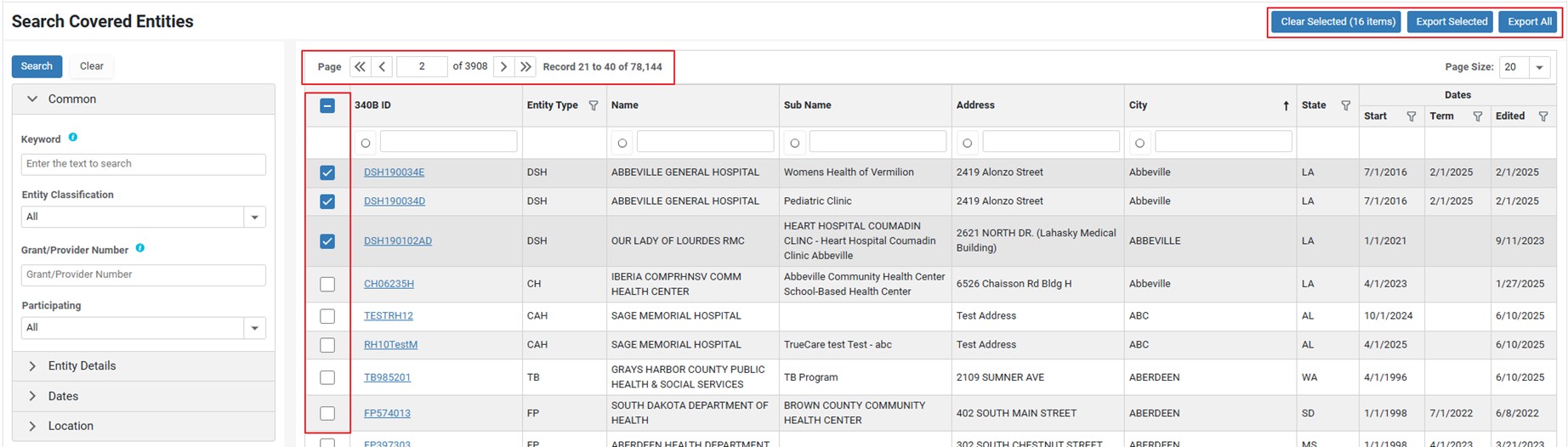 Export All Covered Entity Search Results |