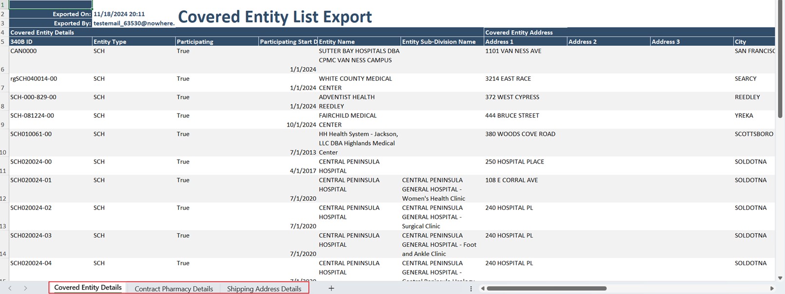 Worksheets Description Covered Entity Details Displays the CE Details of the covered entities selected for export. Contract Pharmacy Details Displays the associated Contract Pharmacy details for each of the covered entities selected for export.