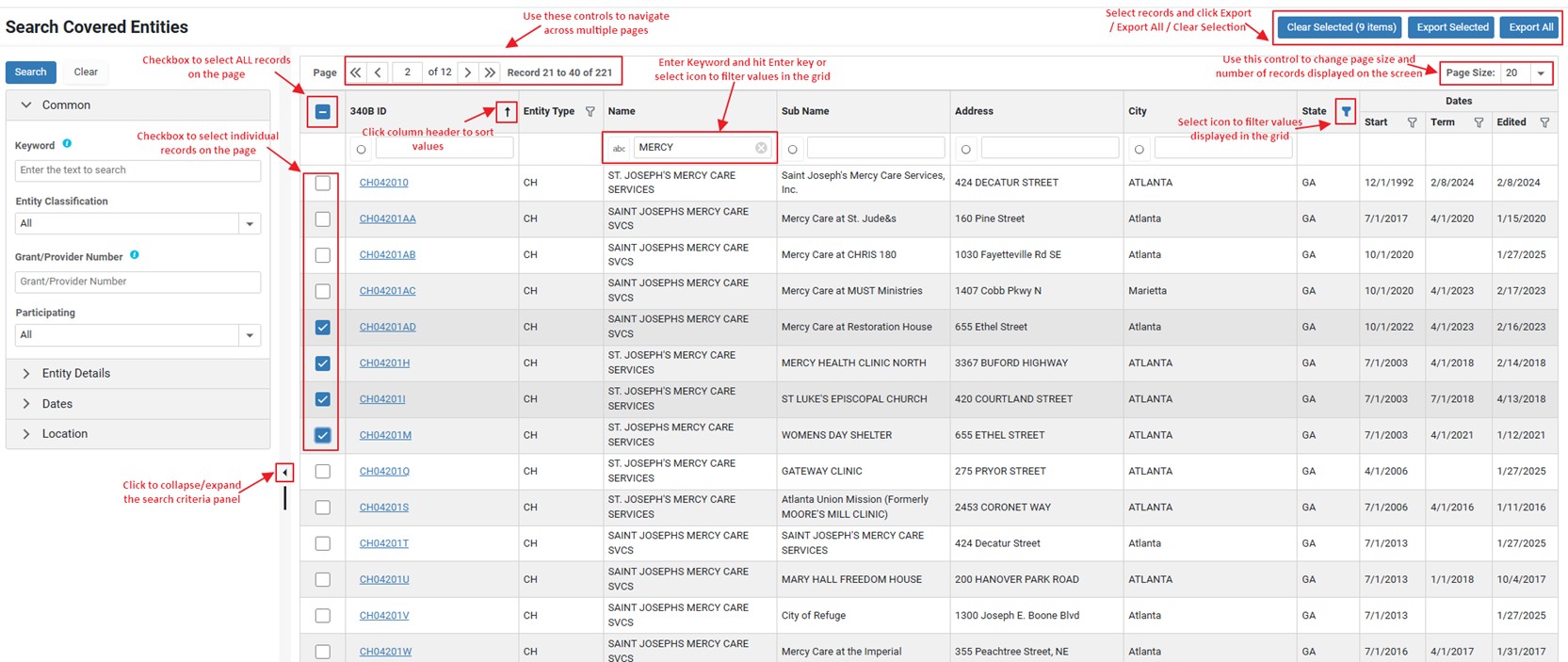 After generating a list of covered entities that match your search criteria, you can specify how you want to view them. Search results are initially sorted by